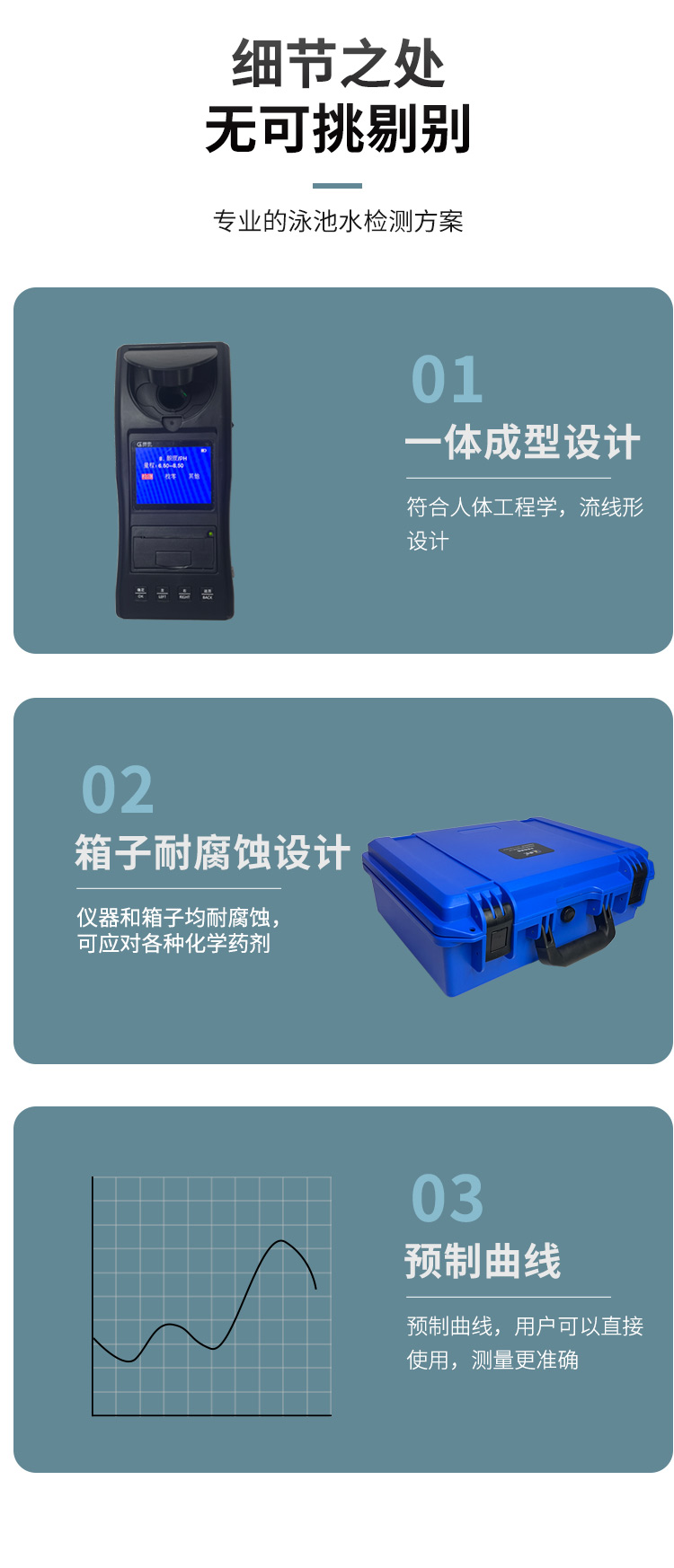 1、相比于傳統(tǒng)的試劑試紙測(cè)定,貫奧泳池水質(zhì)檢測(cè)箱的檢測(cè)數(shù)據(jù)更準(zhǔn)確,檢測(cè)速度更快。