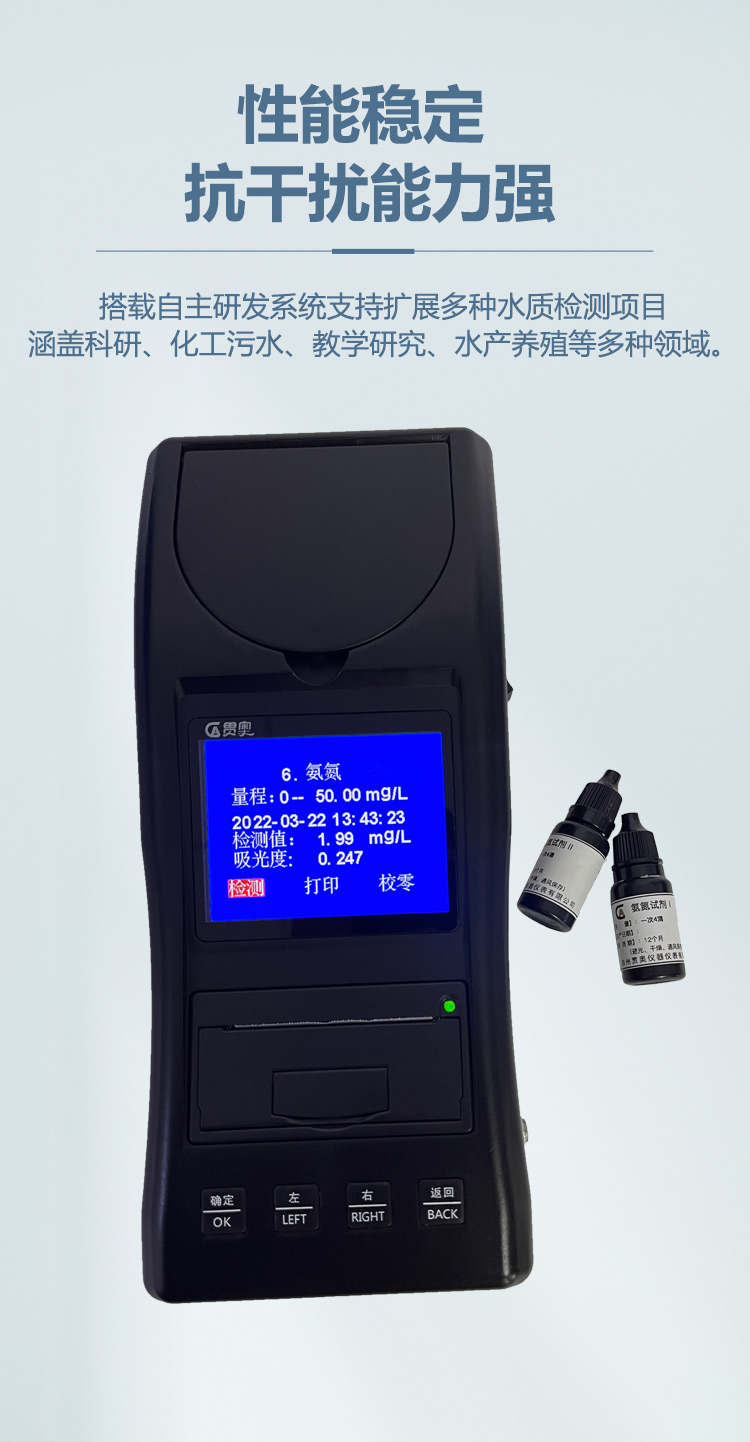 • 氮素類水質專用檢測儀可用于測定水中不同形態的氮:硝酸鹽氮、亞硝酸鹽氮、氨氮等參數。本儀器接受定制,用戶可根據需求定制所需的參數。